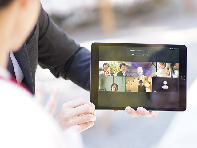 このタイミングで、遠方の親族や友人たちにも「Zoom」で二人の晴れ姿を披露する。