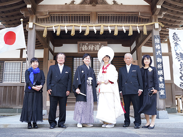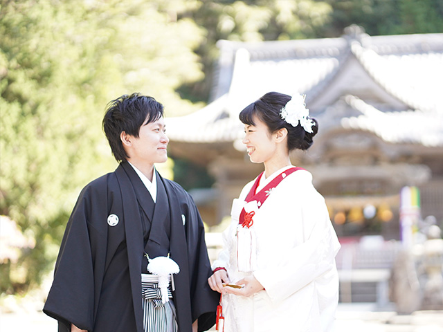 神前式挙式を執り行なう白濱神社に到着。神社周辺で写真撮影を行なった。