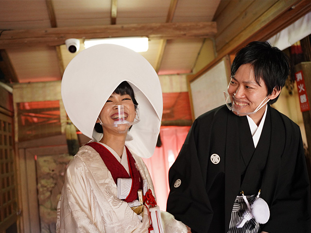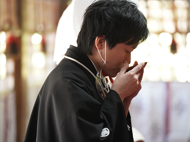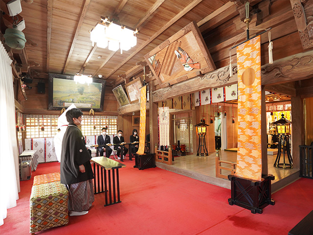 神前式挙式が始まる。拝殿内では宮司様、巫女様のご案内に合わせて進行。