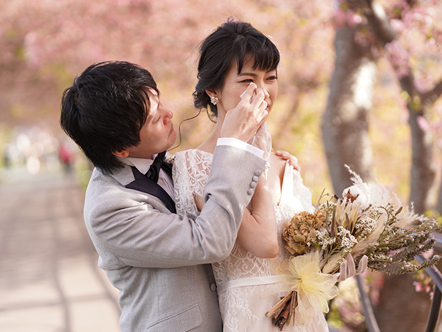 河津桜の咲き誇る河津川へ到着し、桜ロケーションでのウェディングフォト撮影を行う。