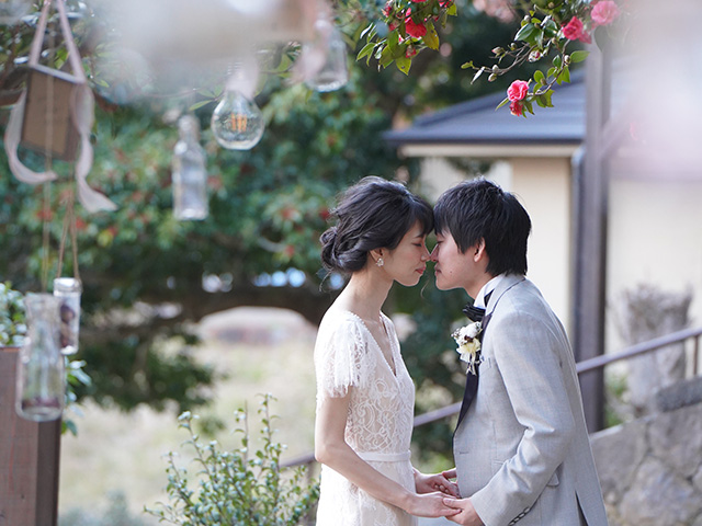ウェディングフォト撮影後に咲楽へ到着すると、思いがけないサプライズ。華やかに飾られたガーデンでの人前式挙式へ案内される。